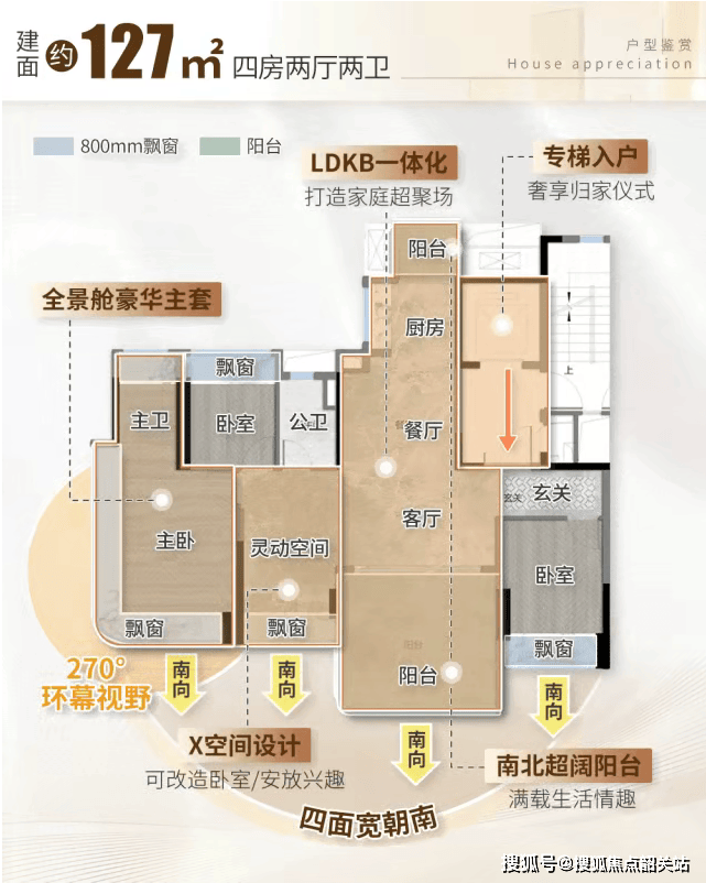 客厅空间宽敞灵活,由于承重墙较少,业主可以根据实际需求将客厅与旁边的空间打通,形成一个长达七点三米的大横厅。这样的空间尺度,无论是举办家庭聚会,还是让孩子自由玩耍,都绰绰有余。主卧套房设计更是锦上添花,配备了二百七十度的弧形转角飘窗。清晨,您可以在阳光的轻抚中醒来;夜晚,您可以躺在窗前欣赏城市的璀璨夜景,惬意无比。此外,南北双阳台的配置,极大地提升了生活的实用性。北阳台可以用于晾晒衣物和存放杂物,南阳台则可以布置成休闲区,摆放一套茶具,品茶观景,享受悠闲的时光。每一个细节都经过深思熟虑,旨在为业主提供最舒适的居住体验。